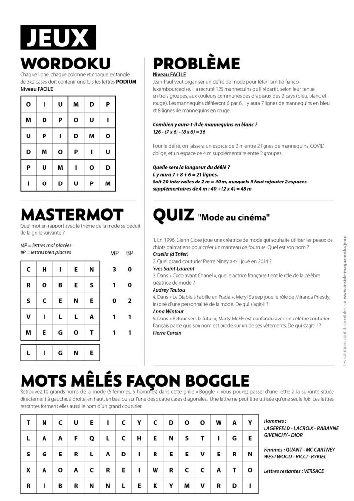 Découvrez les solutions des jeux du magazine Inside 95 d’avril 2021. Vous y trouverez toutes les réponses au Wordoku, au problème, au mastermot, aux mots mêlés façon boggle & au quiz sur la mode au cinéma !